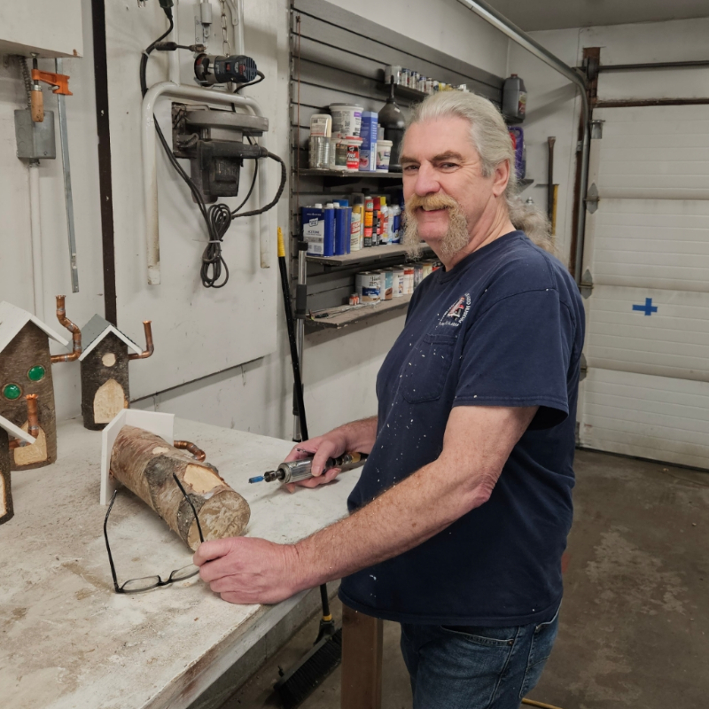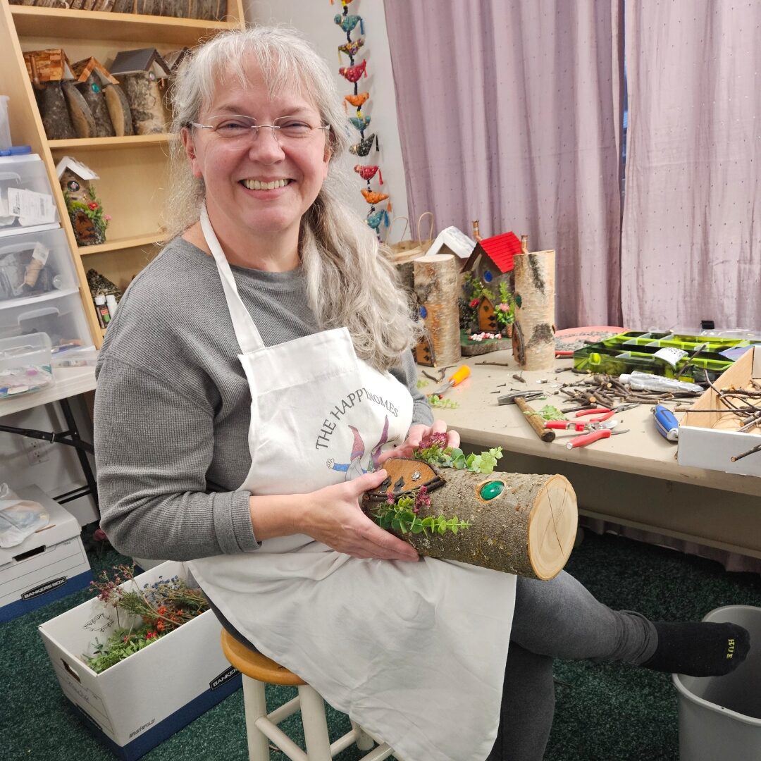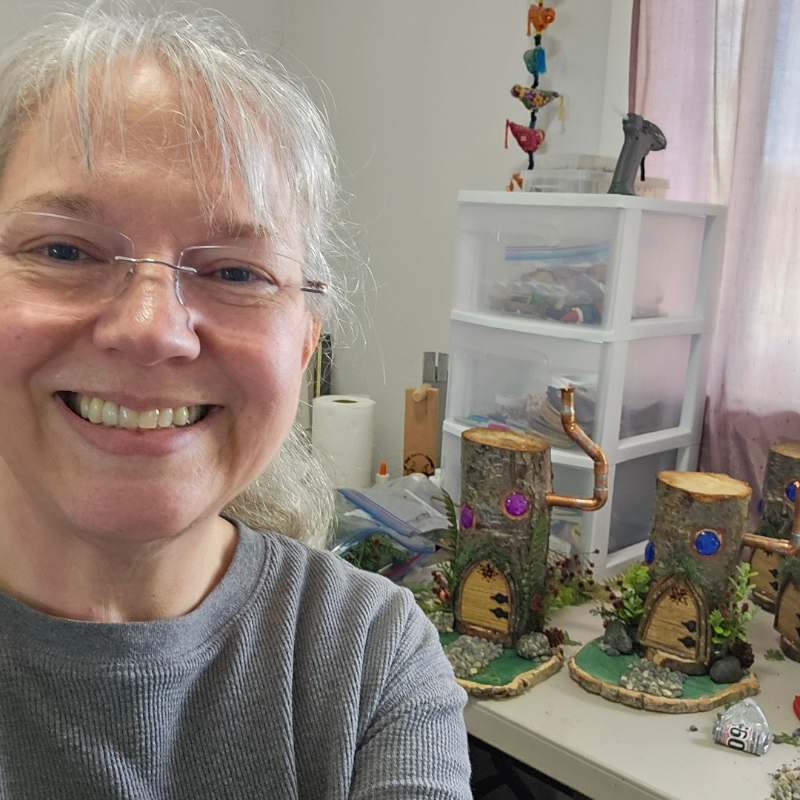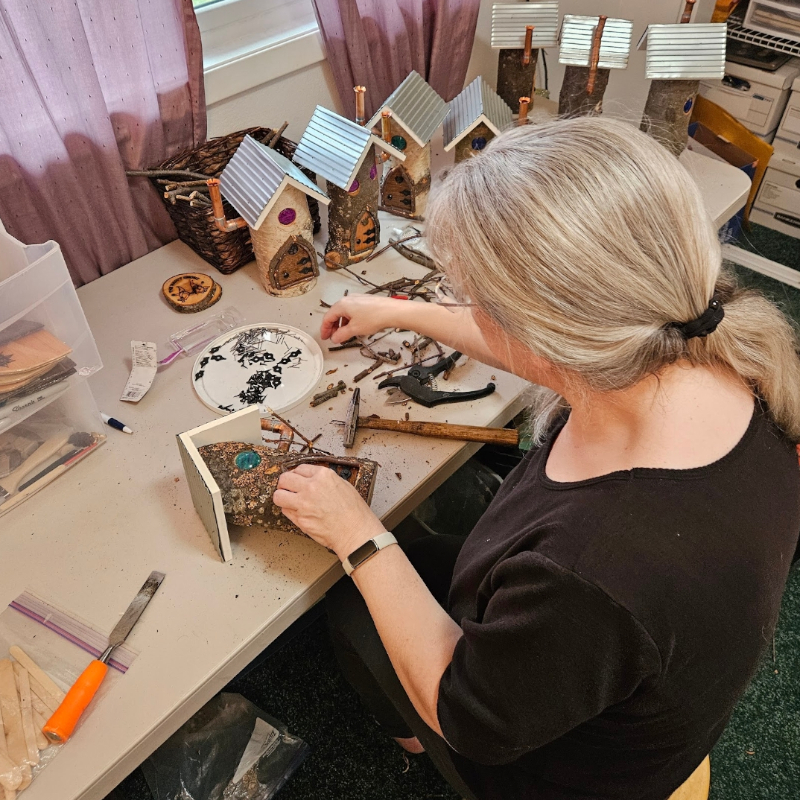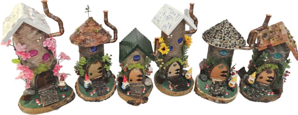 Each home is fitted with a copper stove pipe, some plastic green foliage and small flowers and then securely attached to a base (cross section of a tree) with either a twig or pebble pathway, one or two rocks, a pinecone or two and a few resin mushrooms. This is then sprayed with two coats of a clear sealer.